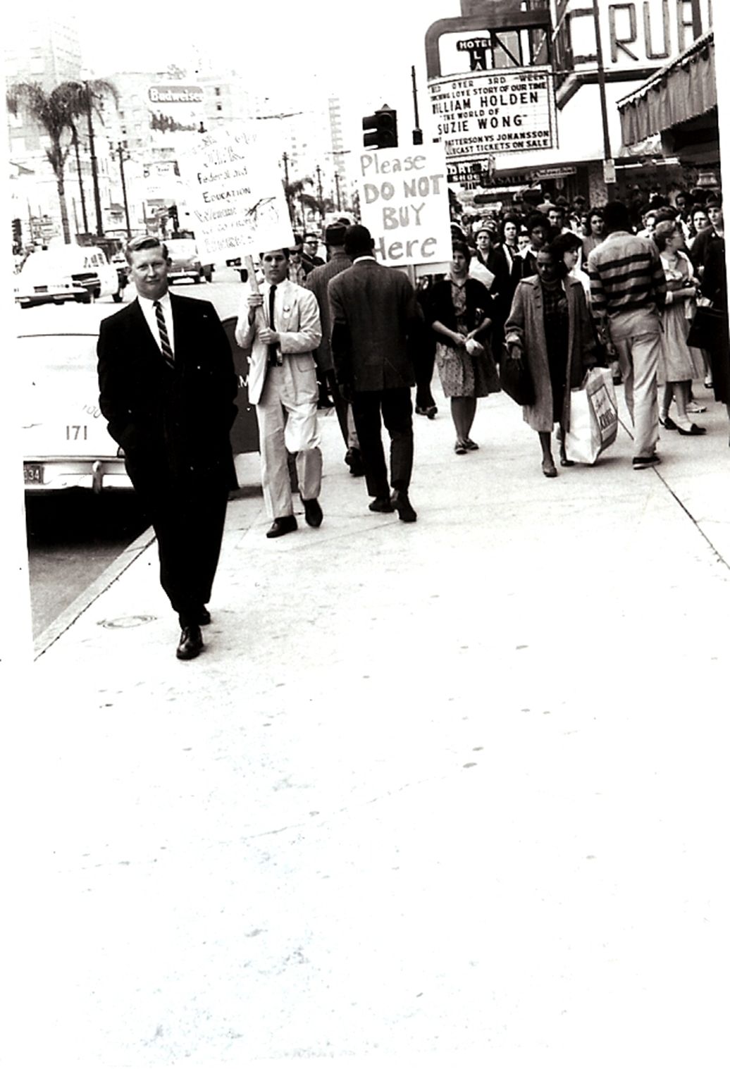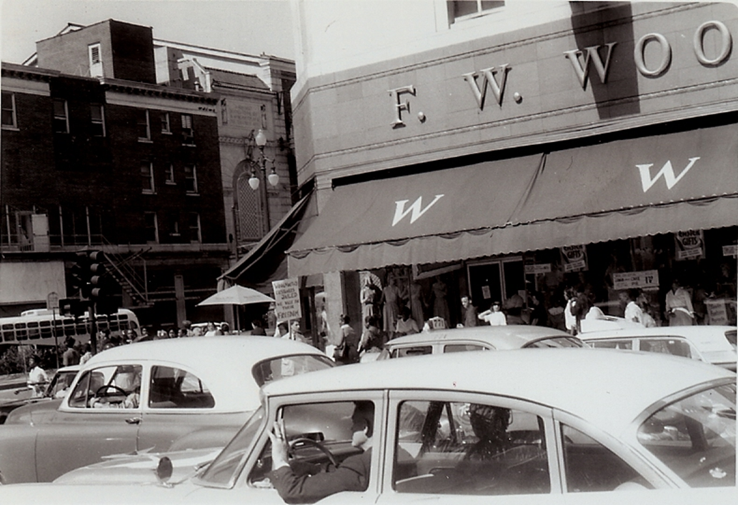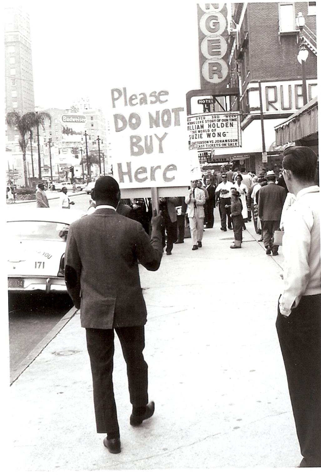 The way it was organized was that two people at a time, each carrying a sign, each starting at the opposite edge of the public space facing the store front, would walk up and down on the outer edge of the sidewalk in front of the store, crossing each other at the midpoint of their route, for the duration of their turn of picketing. (I can’t remember if the turn was for one or for two hours.) Then that pair would be relieved by another pair for their turn of patrolling the store. Everyone was supposed to be very polite, very correct, and very non-violent in their demeanor and actions. There was one other white person there that day, a blonde girl, who I didn’t actually meet. All the other demonstrators were very conservatively dressed, young, and black.