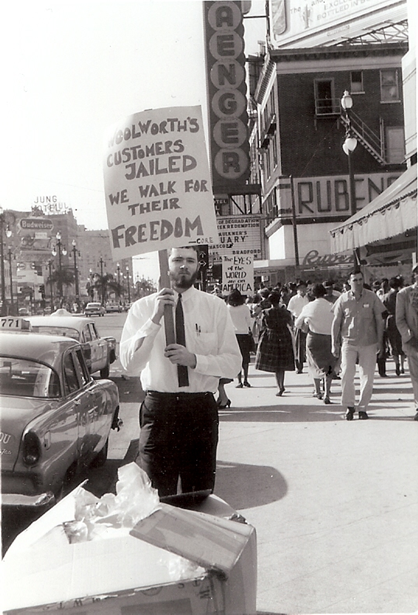 Leonard introduced me to the black girl who was my partner, whose name I didn’t really catch in the heat of the moment, I picket out a signboard, and then we started patrolling. I was 6 ft. 3 in. tall, weighed about 220 pounds, (The previous summer I had worked in a steel-fabricating plant in Ohio, and so was in pretty good shape.) and had a beard. (At this time beards were still so uncommon that they sometimes called for public comment, and I would be asked if I was Amish, a Jehovah’s Witness, a Hippie, or part of a rumored new social phenomenon that identified me as a Beatnik. I didn’t happen to be any of those things, but it comforted my questioner to place me in one or another category.) I was a little nervous as I picketed, which I dealt with by making some jokey comments to my partner while I paraded up and down. The point was that I didn’t look very respectable to my fellow demonstrators, nor did I show a sufficient gravitas to my colleagues, for whom this was a very serious, even life-threatening business, and everyone in our group seemed relieved when my turn was over without incident. My shift over, I left immediately – so I never even met the other demonstrators.