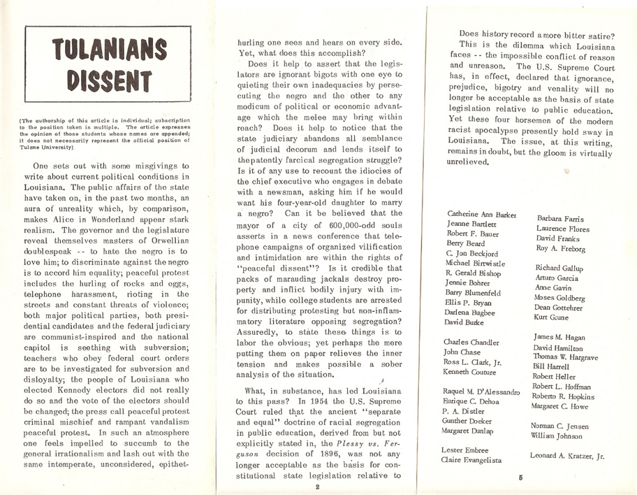 As “managing editor,” I recruited a small group of other undergraduates to hand out the paper around campus. Most of these were students from up north who had already decided that they were not coming back to Tulane next year anyway for academic or personal reasons. But, despite vague fears, there never were any violent confrontations about these matters on the campus. Tulane, calling itself “The Harvard of the South,” prided itself on its urbanity, had heavily recruited both students and faculty from around the country and abroad, and it was more liberal in its thinking than the surrounding city. Any overt hostility was suppressed, maybe only breaking out in the ferocious passion with which some of the fraternities — some southern, some New York Jewish — played each other in the intra-league softball games.