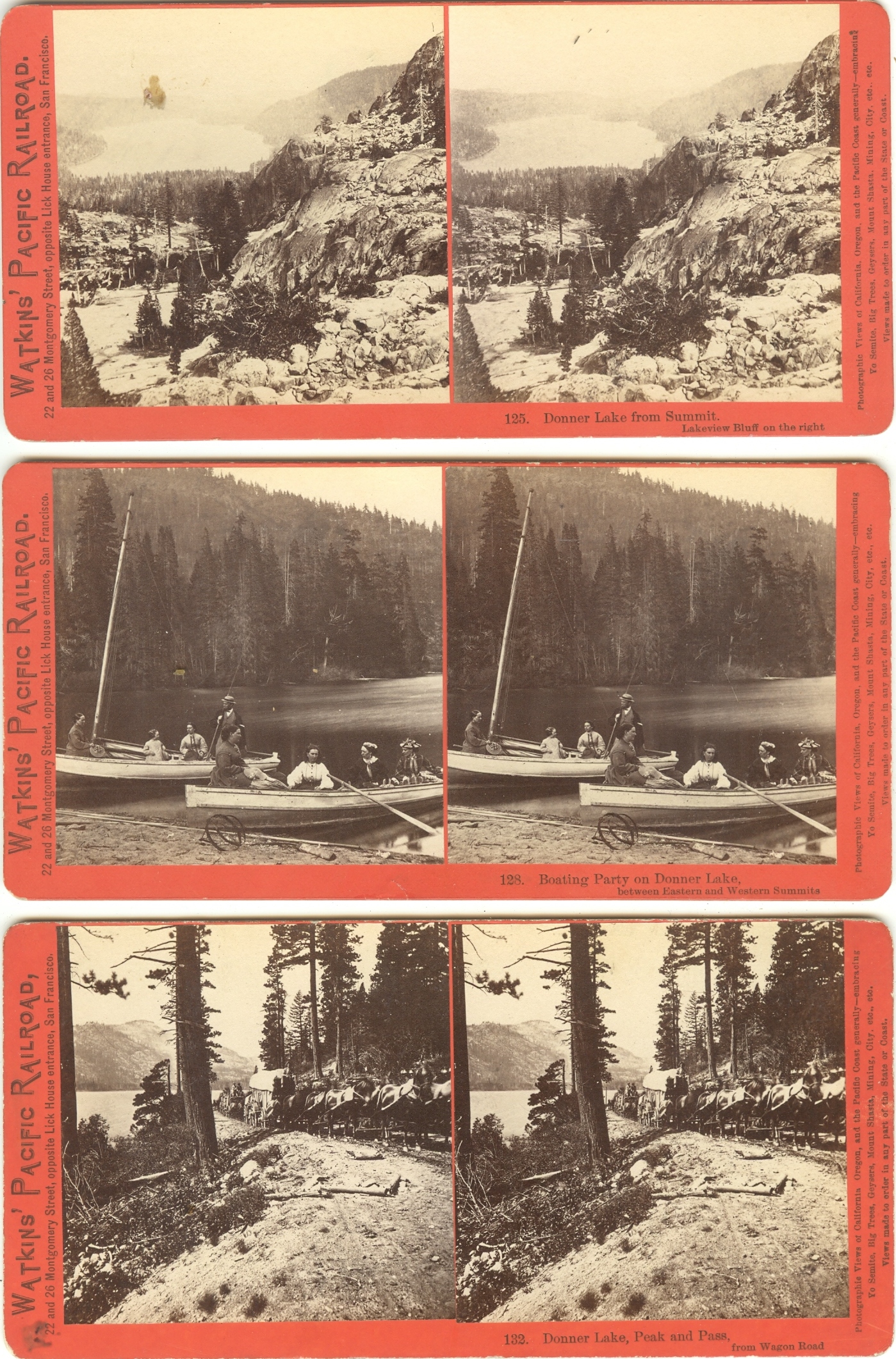 “…Among the existing collections of Watkins’ stereos, in particular the Society of California Pioneers’ collection assembled by Turrill, are about three hundred views of the construction of the Central Pacific Railroad. These views were made by Alfred A. Hart, a Sacramento photographer, and the negatives were purchased by Watkins (27). He incorporated these into his own series of stereos and printed a portion of them for sale. An extremely valuable small series of stereoscopic negatives relating to the Modoc War were also purchased by Watkins. These had been done by Louis Heller, a photographer of Fort Jones, California, whose pictures were certified by General Jefferson C. Davis to be the official pictures of the war (5).” (Etc., etc.) (p. 12)