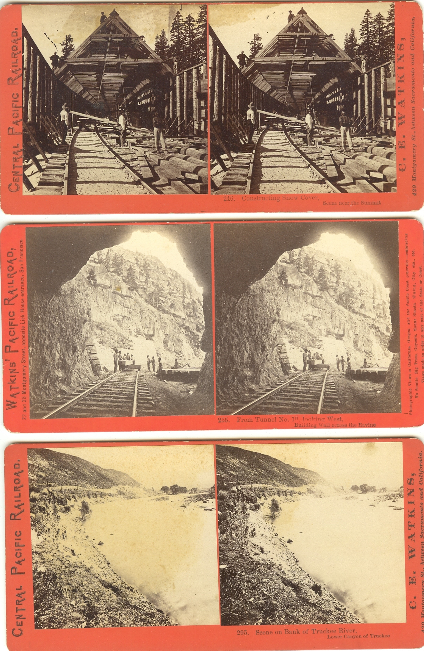 It has already been noted that Watkins obtained from Alfred A. Hart his series of 364 stereoscopic negatives showing the construction of the Central Pacific Railroad. These were progress pictures, and it seems to have been Hart’s plan to go each successive season to the then terminus of the road, photographing the work in that vicinity as well as in sections which had not been visited on previous trips, and also filling in views of structures which had not been begun at an earlier period. This explains the view of the round house at Rocklin, which chronologically is not in its proper place in the list….” (p. 35) “…. During the construction and the early days of the Central Pacific Railroad, Watkins did a large amount of photographic work for the company, though for some reason this did not begin until after the making of the Hart series before referred to. Watkins made photographic reproductions of a great many plans and drawings for the engineering department and for other departments of the road….” (p. 37) (Etc., etc.)]