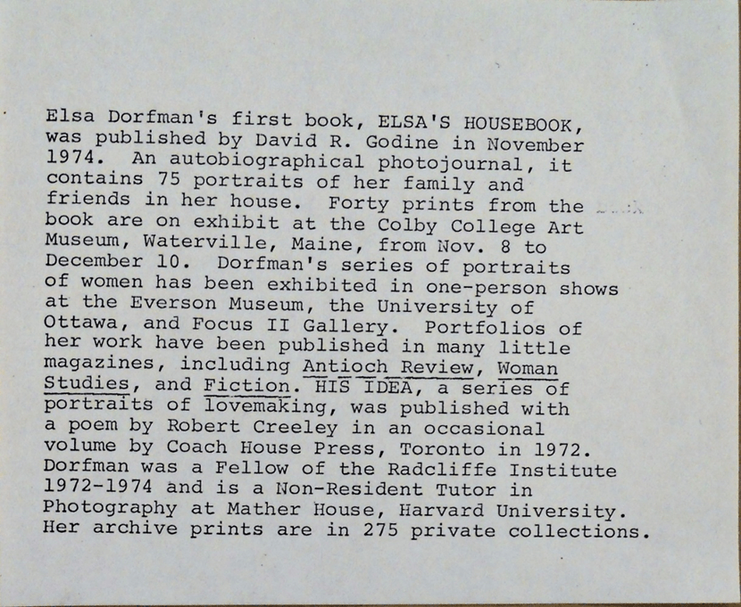 One of the people who helped rebuild the journal was Elsa. She showed up one day and offered to write a “gossip column.” Which she did and did well – digging up and collating items of news and interest about the photographic community at large by calling people on the phone and chatting and finding out about their professional activities (Exhibitions, awards, etc.) and their personal lives (Marriages, births, etc.); which she presented with the same effortless grace and humor that she brought to her picture making. Some thought that sort of information was outside the scope of the journal. Susie and I thought it helped balance the academic rigor with some human feeling.